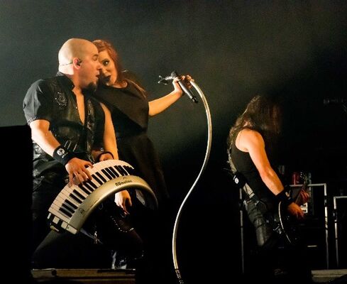 Nu dan nog de band waar het uiteindelijk allemaal om begonnen is en waar het festival om draait, Epica. Het podium is al helemaal omgebouwd met allerlei licht-elementen. Ook werd er vooraf al gewaarschuwd dat de band pyro ging gebruiken. Wij, de fotografen, moesten dus wachten tot we het sein kregen dat we de fotopit in mochten. Dit gebeurde tot twee keer toe, tussendoor moesten we weer even weg. Maar ja een gesmolten zonnekap of verbrande wenkbrauwen is ook niet alles. Voor mij was het tien jaar geleden dat ik de band nog heb gezien (Progpower Baarlo) en ik kan wel zeggen dat de band in die tijd gigantisch is gegroeid. Er staat een goed geoliede machine die soepel door alle nummers heen speelt.